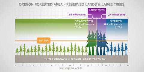 The graphic at the top of the blog shows the 31 million acres of forestland in Oregon as arrayed along a ruler. The green area on the left represents the 22.6 million acres of non-reserved forest, while the blue area to the right represents the 8.4 million acres of Reserve Forest Areas. The 5 million acres of large trees is shown as a purple band that crosses the blue-green boundary, with 2.4 million acres of non-reserved large trees shown in green with purple overlay and 2.6 million acres of reserved large trees shown in blue with purple overlay.