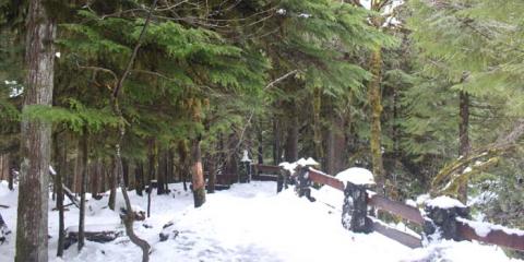 Sahalie Falls is an exciting start to the Waterfall Trail hike. “Sahalie” is a Chinook word for “high.” Navigating the snowy path required stepping into the foot-size impressions and grabbing the thin trees for balance. It would be easy to become a victim of gravity on the icy layer of snow covering the trail. It felt like a narrow busy street, with the rush of the McKenzie River like rush-hour traffic and the towering trees like skyscrapers. I stomped down the center of the trail, occasionally stepping too far to one side and finding my lower leg swallowed by the snow. Luckily, the younger trees along the trail guided my direction. Trees filled with heavy clumps of snow escorted me along the trail of muddy rocks and hemlocks. Eventually I saw the familiar sight of a mossy banister.