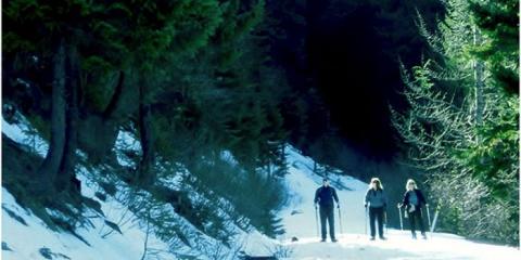 The open forest canopy above the road allowed snow to fall to the ground, and the trees shaded the frozen snow. We hiked on four to six inches of icy crust, marveling at the preserved prints of deer, elk and either a very large dog… or a cougar. With white path below and blue sky above, we hiked about two miles before enjoying a picnic lunch and making the trek back down the hill.