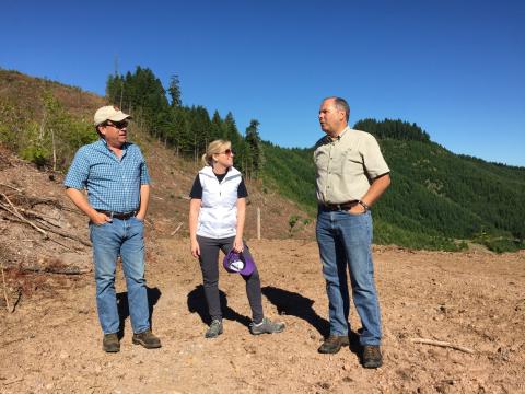 OFRI Executive Director Erin Isselmann, center, joins OFRI board chairman Quincy Powers, left, and Giustina Resources' Pete Sikora, right, on a forest tour near Eugene.