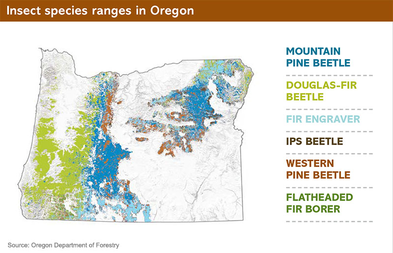 Pests such as bark beetles can detect when a tree is stressed from drought, root disease or storm damage. That’s when they attack, burrowing through tree bark to lay their eggs. Bark beetles often kill trees that are already suffering, and the results can be devastating, especially in central and eastern Oregon.