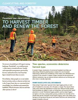 In western Oregon, landowners of commercial forestland most likely use clearcutting, followed by planting trees to replace the ones harvested. Clearcutting is efficient and cost-effective, which means more affordable wood products for the consumer. In eastern Oregon, because the tree species are different, landowners may use selective harvest methods such as thinning, and allow trees to naturally regenerate.