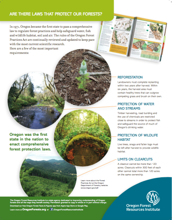Fact Sheet: Protection Are there laws that protect our forests? This one-page fact sheet looks at some of the protective measures created by the Oregon Forest Practices Act. Part of OFRI’s series of Forest Fact Sheets. FactSheet14_Protection_Laws.pdf Add to cart