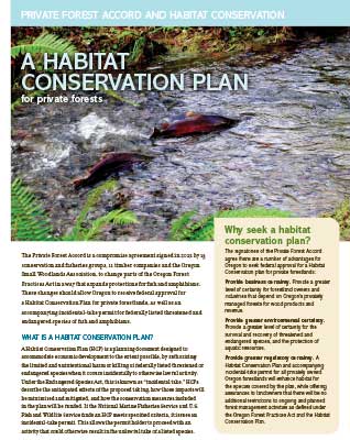 Private Forest Accord and Habitat Conservation One of three topic sheets intended to help small forestland owners understand upcoming changes to forest regulations created in response to the Private Forest Accord report. PFA Summary: HCP