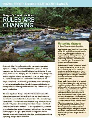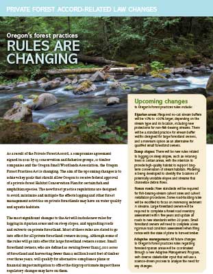 One of three topic sheets intended to help small forestland owners understand upcoming changes to forest regulations created in response to the Private Forest Accord report.