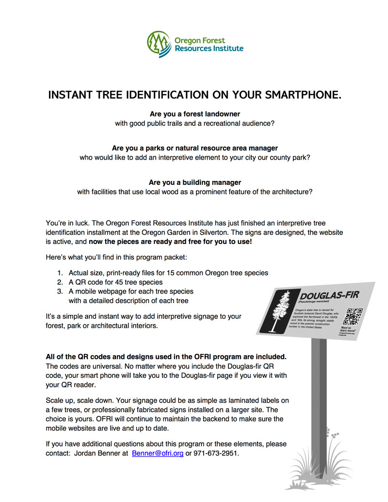 The Oregon Forest Resources Institute has created an interpretive tree identification program. The signs are designed, the supporting website is active, and now the pieces are ready and free for you to use!