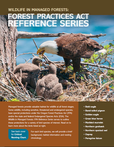 Managed forests provide valuable habitat for wildlife at all forest stages. Some wildlife, including sensitive, threatened and endangered species, have special protections under the Oregon Forest Practices Act (FPA) and/or the state and federal Endangered Species Acts (ESA). The Wildlife In Managed Forests: FPA Reference Series serves to outline these protections for a variety of bird species of interest.