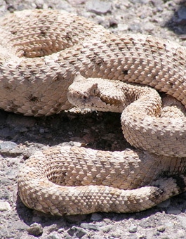It is generally a heavy-bodied snake with large dark spots, a wide triangular head, a distinct eye stripe, and a rattle at the tip of the tail. It averages 31 inches in length.