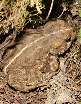 This is a large toad, averaging 4.5 inches in length, with dry, bumpy skin and horizontal pupils. It ranges from reddish-brown to gray to olive green in color, and has a cream-colored stripe that runs down the middle of its back.